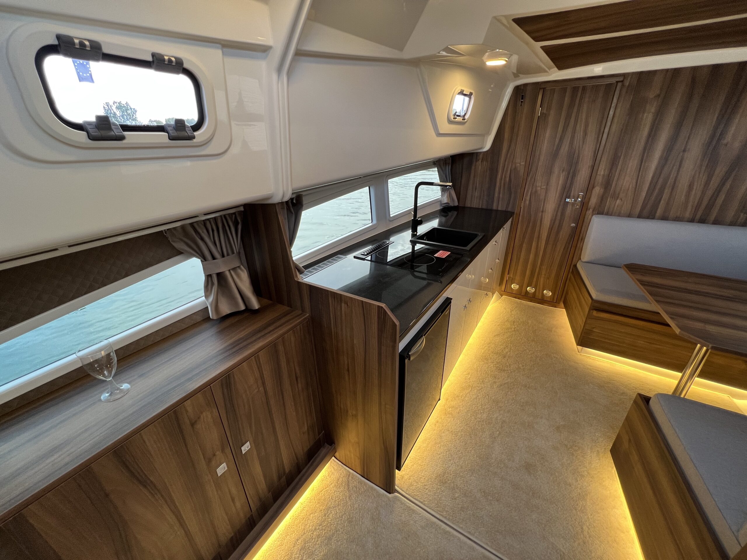 Aufgrund der Bauweise des Rumpfes bieten Halbgleiter ein üppiges Platzangebot. Die Nautic Neon bietet 1,90m Stehhöhe in der Kabine. Dank des modernen Designs und der intelligenten Beleuchtung überzeugt das Boot.